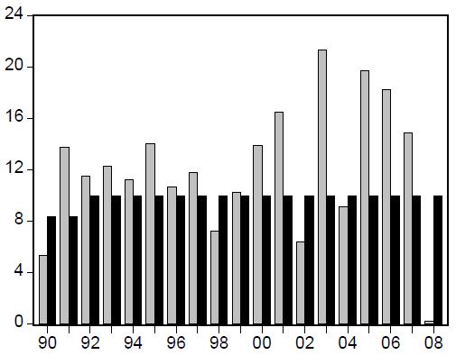 The graph demonstrates that even the sharp rise in the capital/assets ratio from 1998 to 2007 could not prevent the 2008 total collapse of the entire banking sector. Despite this evidence and the fact that there is no research that establishes a correlation between lack of capital and bank failures, most economists and policy makers still believe that raising the capital ratio to 18% or 25% (Minneapolis Fed), or even to include 35% equity (Admati and Hellwig (2014)) will protect taxpayers from having to bailout failing banks. |