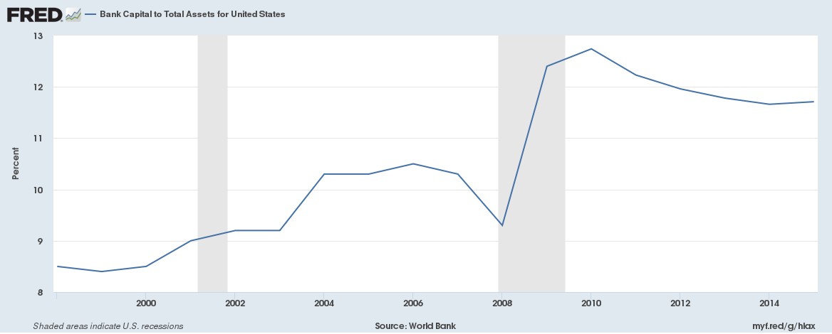 reveals that commercial banks spend over $1 million per week on lobbying activities. Lambert (Forthcoming) empirically demonstrates that banks active in lobbying are 44.7% less likely to receive a severe enforcement action from the regulator. Even if Congress manages to pass laws that limit banks' risk-taking activities, as we show here, often, the key components of these laws are eventually repealed by Congress itself after banks intensify their lobbying activities. 2. Regulatory capture: Regulatory agencies have no incentives to enforce the regulations. In fact, Dagher (2018) examines booms and busts since the 18th Century and presents evidence of pro-cyclical regulatory policies by governments. Risk-taking during booms were often amplified by an increasing light-touch approach to financial supervision. Eisinger (2017) explains why the Justice Department fails to prosecute bank executives. Griffin (2010) examines the history of the Fed and its role as a protector of the interests of large banks. Jacobs and King (2016) argue that the Federal Reserve managed to overstep the U.S. constitution by giving trillions of dollars in loans to financial institutions. Haedtler et al. (2016) argued that the Fed should become fully public in order to represent the diversity of public interests. 3. Regulatory cost: Kupiec (2014) reports that the average employee compensation at bank regulatory agencies is more than 2.7 times that of private-sector bank employees. Taxpayers eventually pay the bills. Simply put, regulatory agencies are costly! The myth behind capital requirements as a way to prevent bank failuresThe graph below (source) depicts U.S. banks' capital to assets ratio during 1998-2015.