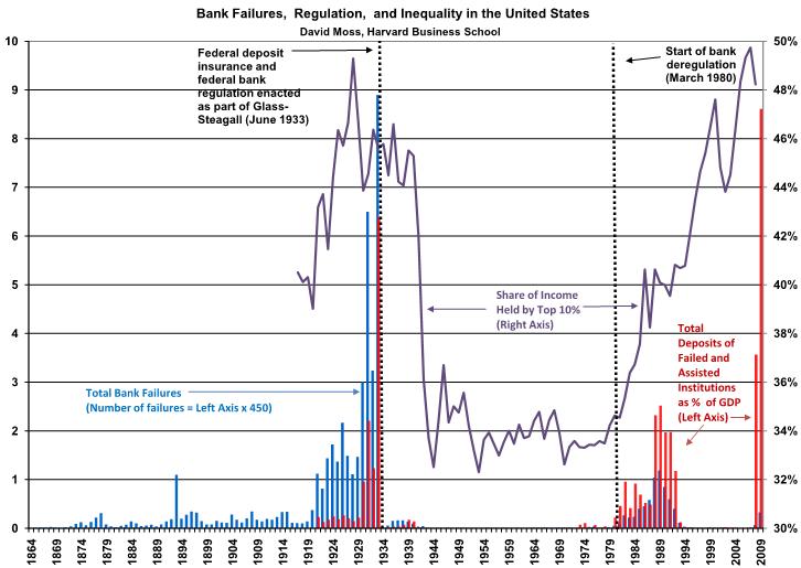 British bank failures and government bailouts: 1825, 1836, 1847, 1914, and 2007-2009. Major U.S. banking crises: 1792, 1837, 1839, 1857, 1863, 1873, 1884, 1890, 1893, 1896, 1907, 1920s, 1930-1933, 1980s, and 2007-2009. The chart below (source) illustrates the number of U.S. banks that failed since 1864. As the figure shows, bank crises follow a cycle of 10 to 20 years, with the exception of the period between the 1940 to the mid-1980s (S&L crisis). The author identifies correlations between bank failures and income inequality
