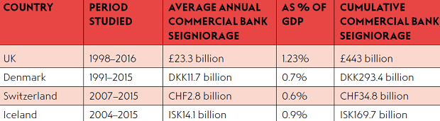 Bjerg, Ole, Duncan McCann, Laurie Macfarlane, Rasmus Hougaard Nielsen. 2017. "Seigniorage in the 21st Century: A Study of the Profits from Money Creation in the United Kingdom and Denmark." Available at SSRN 2921225.
